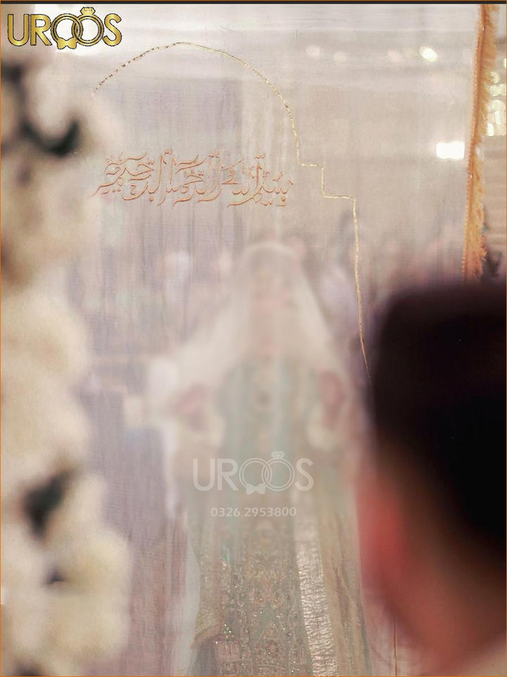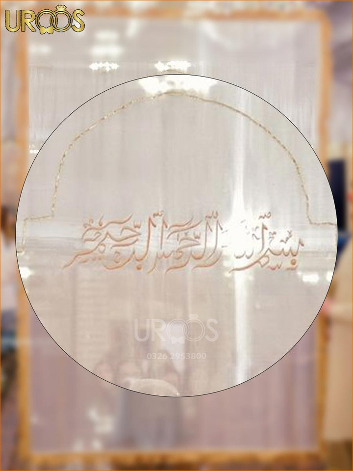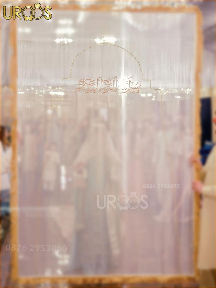 Make your Nikah entrance a moment of spiritual serenity with Baab-e-Tasmiah — a graceful walk-in banner featuring the most recited and beloved verse of the Quran. This soft net panel, designed in a masjid-style arch, frames the bride’s arrival in the name of Allah — setting the tone for a day filled with mercy, love, and divine blessings.