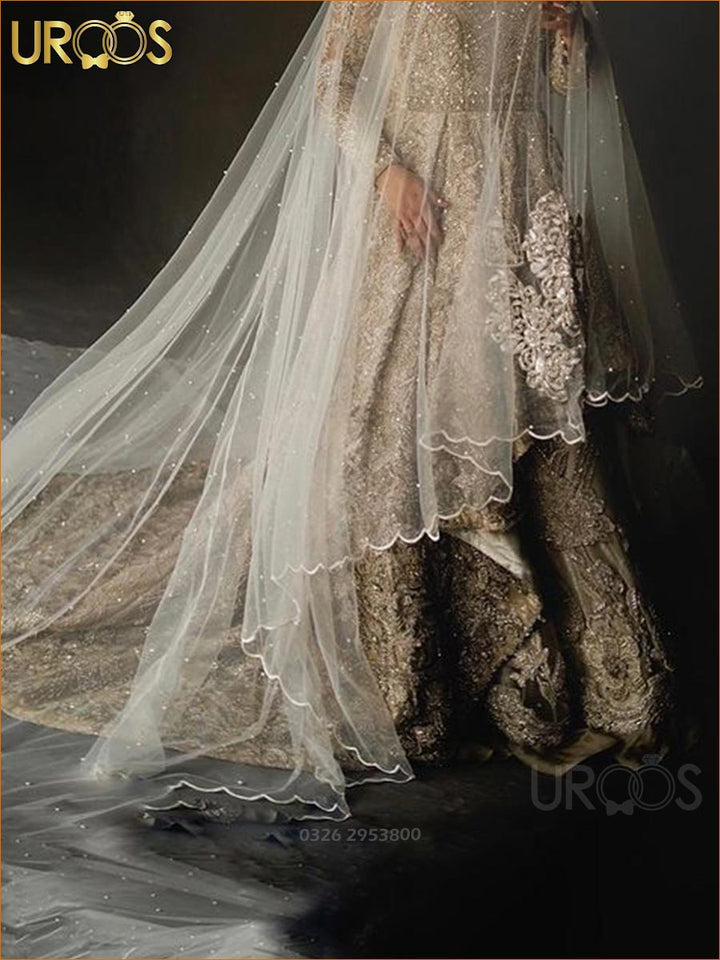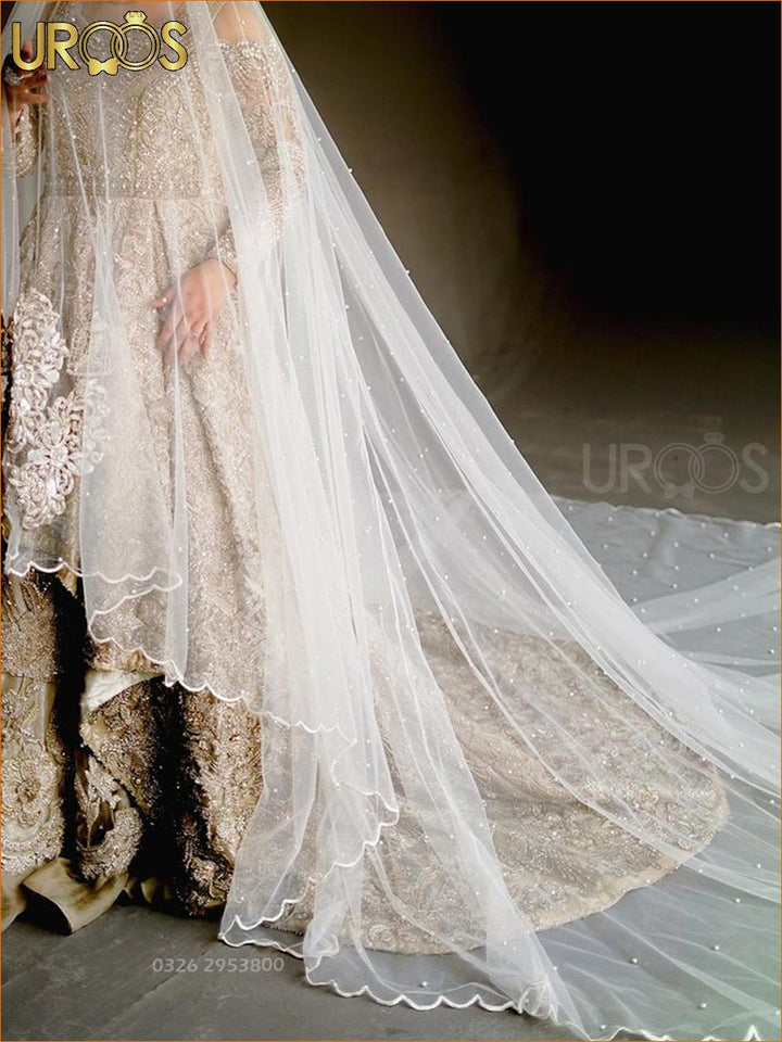 Gracefully elegant, this bridal veil blends tradition with timeless charm. Crafted from premium soft net and adorned with delicate pearls, its standout feature lies in the luxurious scalloped cutwork — perfect for a dreamy Nikah day look.