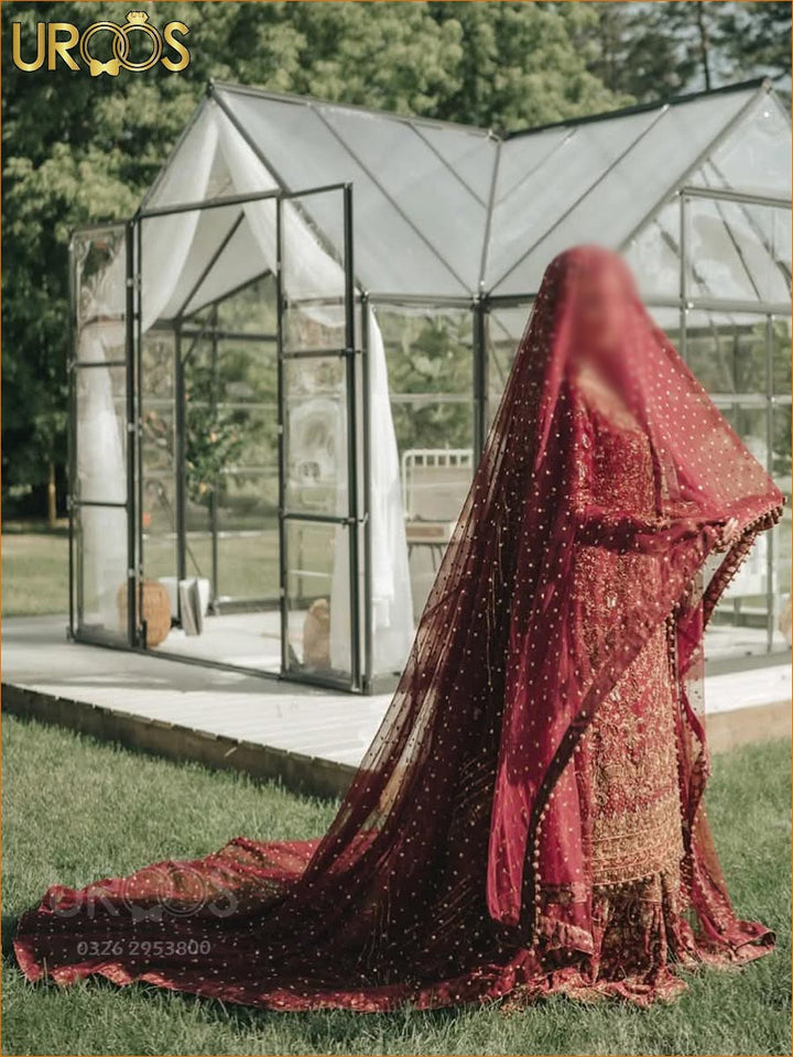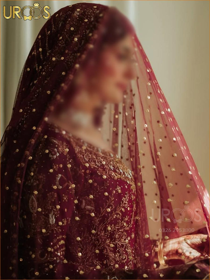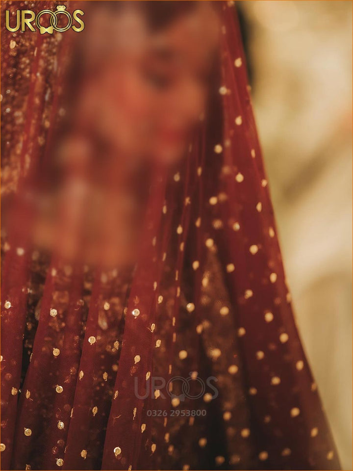 Mehroon Aab captures the regal charm of deep maroon paired with golden elegance - a combination that speaks of tradition and royalty. Crafted from premium soft net, this veil flows gracefully, creating a stunning bridal silhouette. The delicate golden polka embellishments and finely stitched lace border add an opulent touch, making it perfect for Nikah, Barat, or any grand celebration.