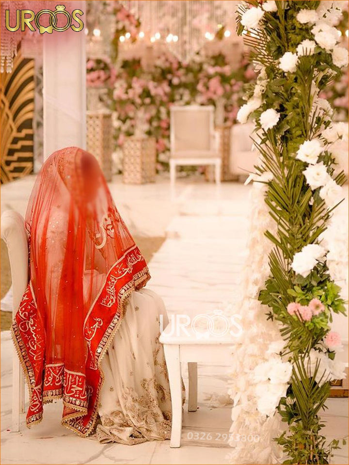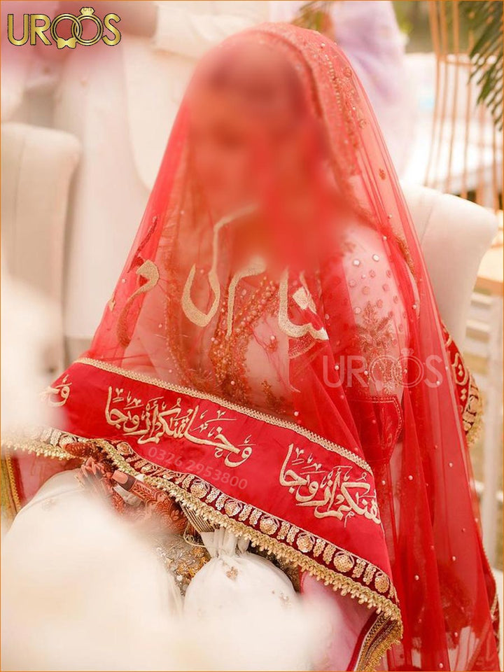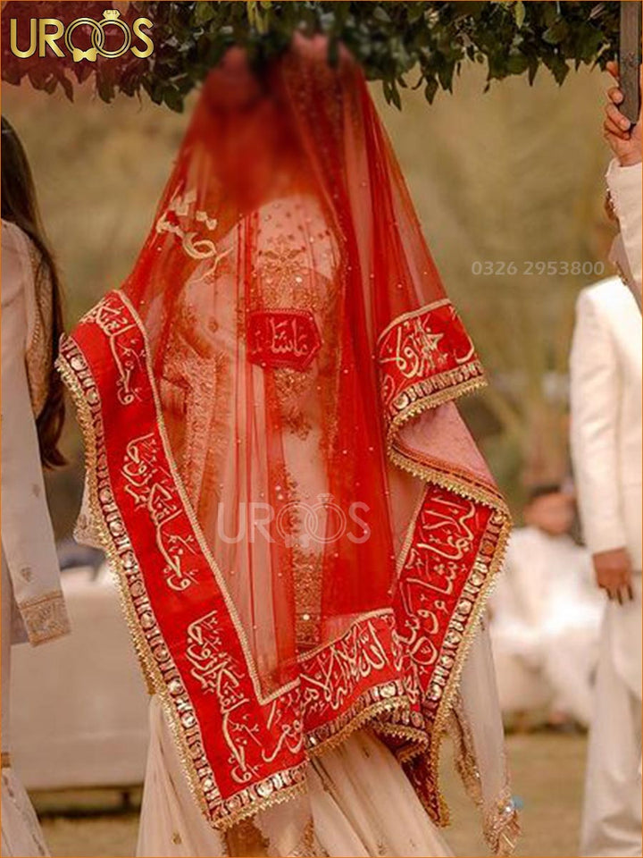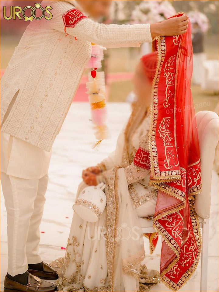 Perfect for your Rukhsati, this dupatta features beautifully embroidered Quranic verses that reflect the purity and blessings of your sacred union. It adds a soulful elegance to your bridal look, making your farewell moment even more meaningful.