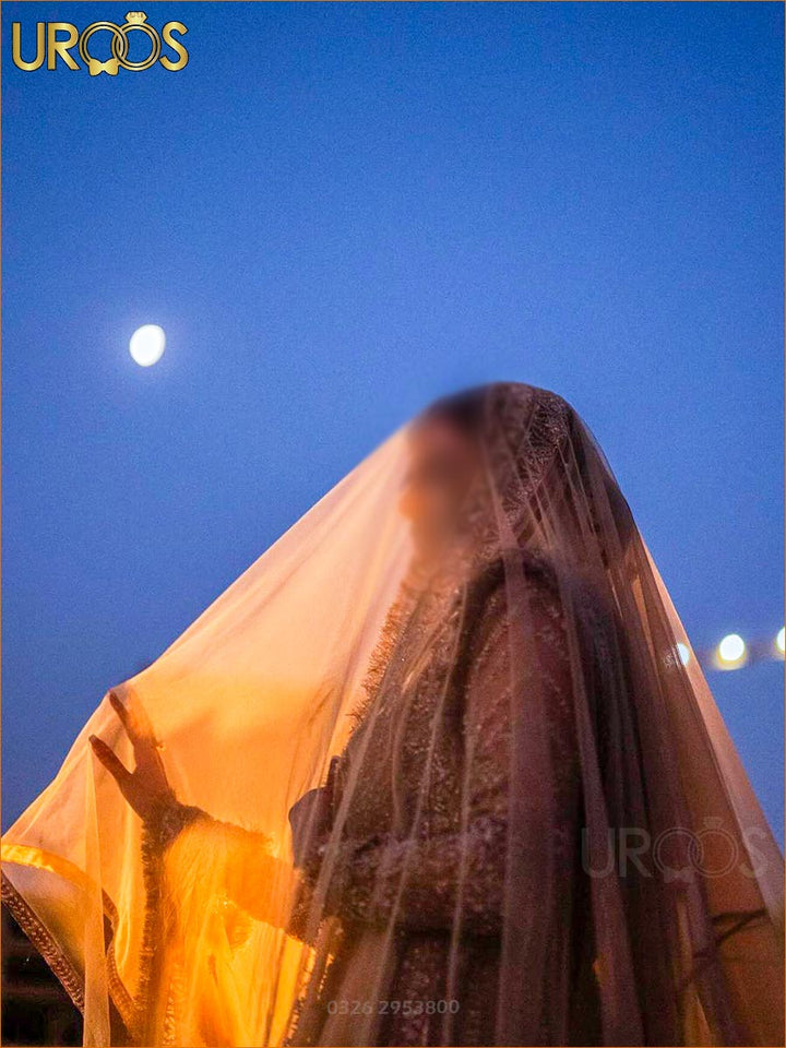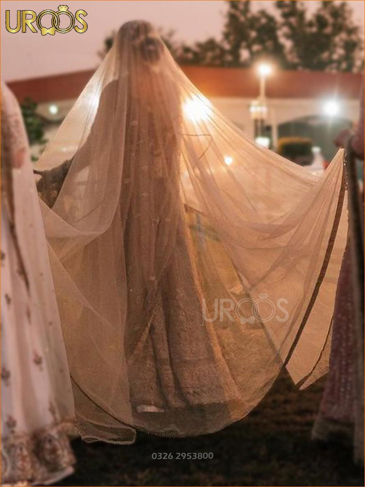 Shaam-e-Uroos is inspired by the golden hues of dusk — a moment when everything feels magical. Made with high-quality soft net, this veil drapes beautifully and flows like poetry in motion. The finely attached lace along the border adds a refined touch, making it a timeless piece for your Nikah or wedding ceremony.