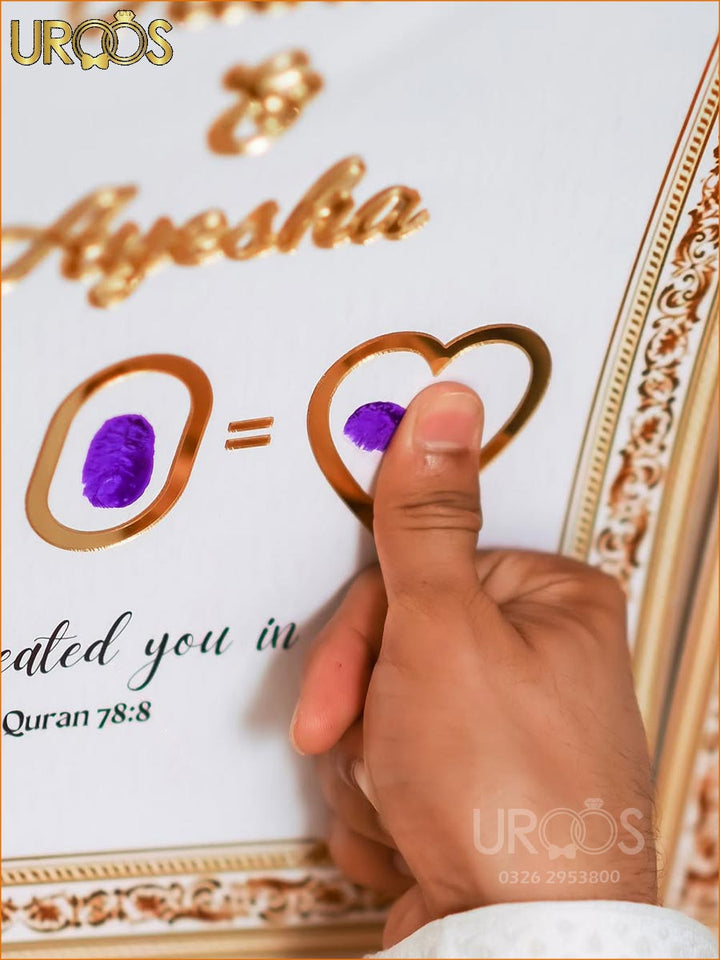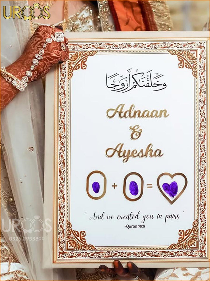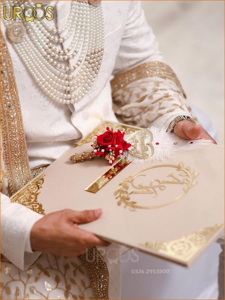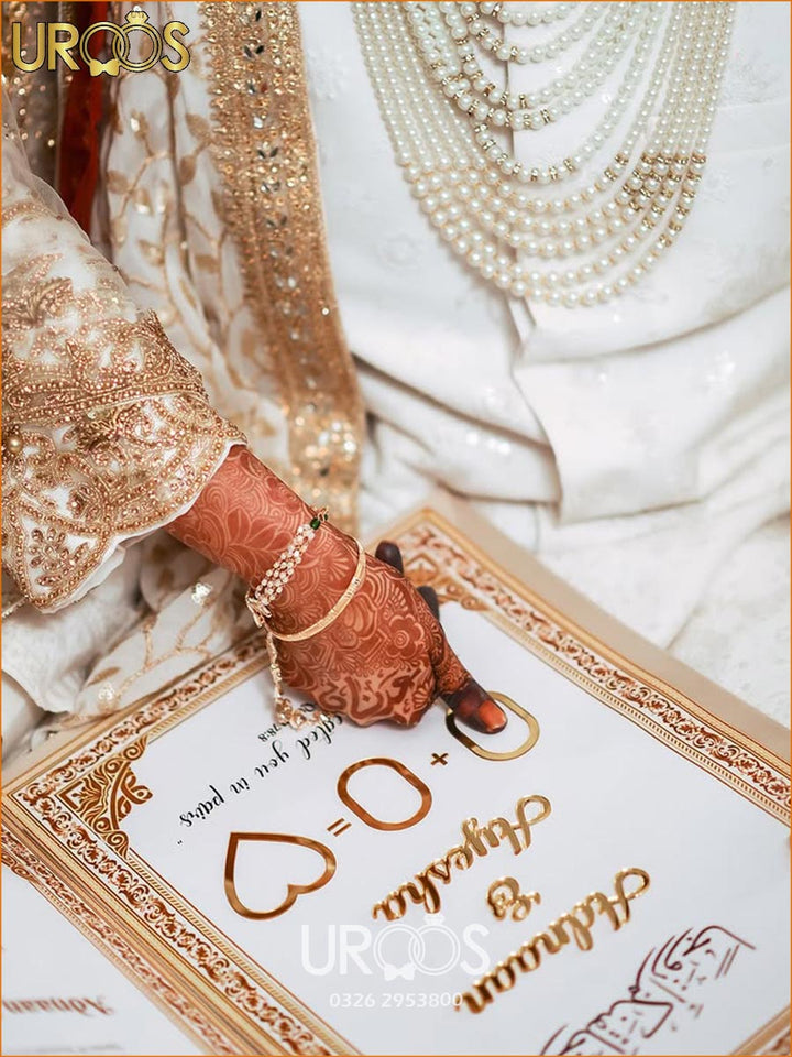 Waraq‑e‑Uroos by Uroos is a beautifully crafted velvet-bound booklet designed to hold your Nikah Nama and commemorate your marriage vows. Encased in plush velvet and finished with elegant golden or acrylic detailing, this booklet serves as both a ceremonial piece during the Nikah and a cherished heirloom afterwards.